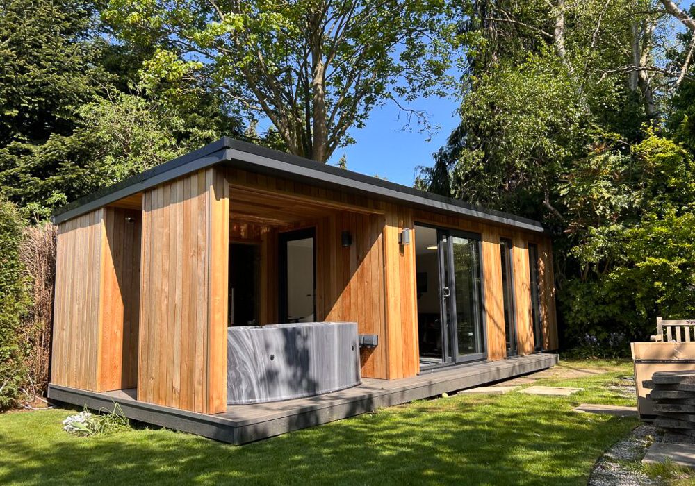 Lux Garden Rooms created this impressive lifestyle retreat in Leeds, combining a home office, gym, sauna room and covered jacuzzi area. The 8.1m x 3.5m building is fully insulated and decorated, with a sauna featuring LED lighting and a canopy providing year-round outdoor comfort.